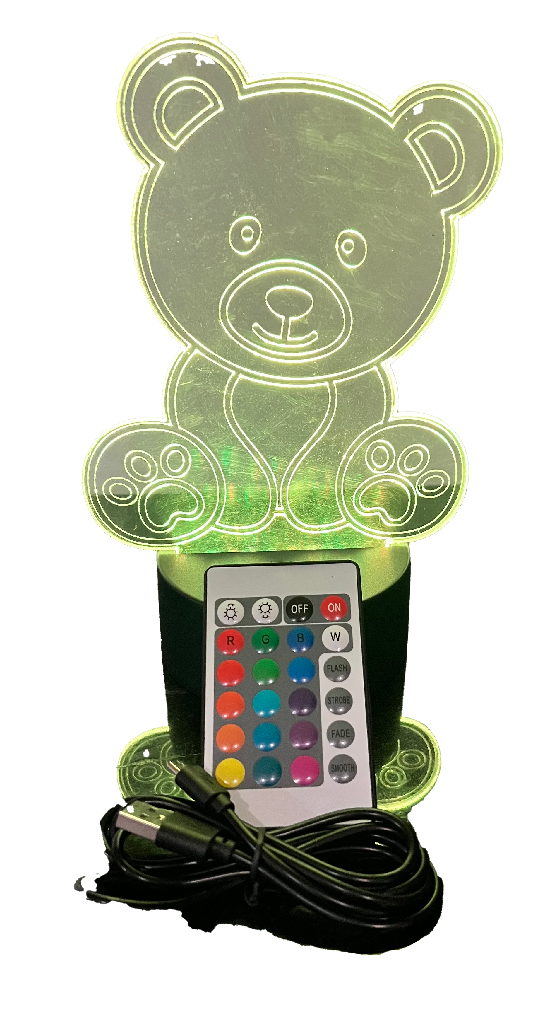 This 150mm tall Teddy Bear Night Light is the perfect addition to any child's room. Its remote control feature allows for easy operation, while the etched acrylic design adds a touch of whimsy. Never stumble in the dark again with this adorable and functional night light. The colours and intensity are adjustable by the front power button or the remote control. It can be run on a USB cable ( Included) or 3 AA batteries. The acrylic is 3mm think.
